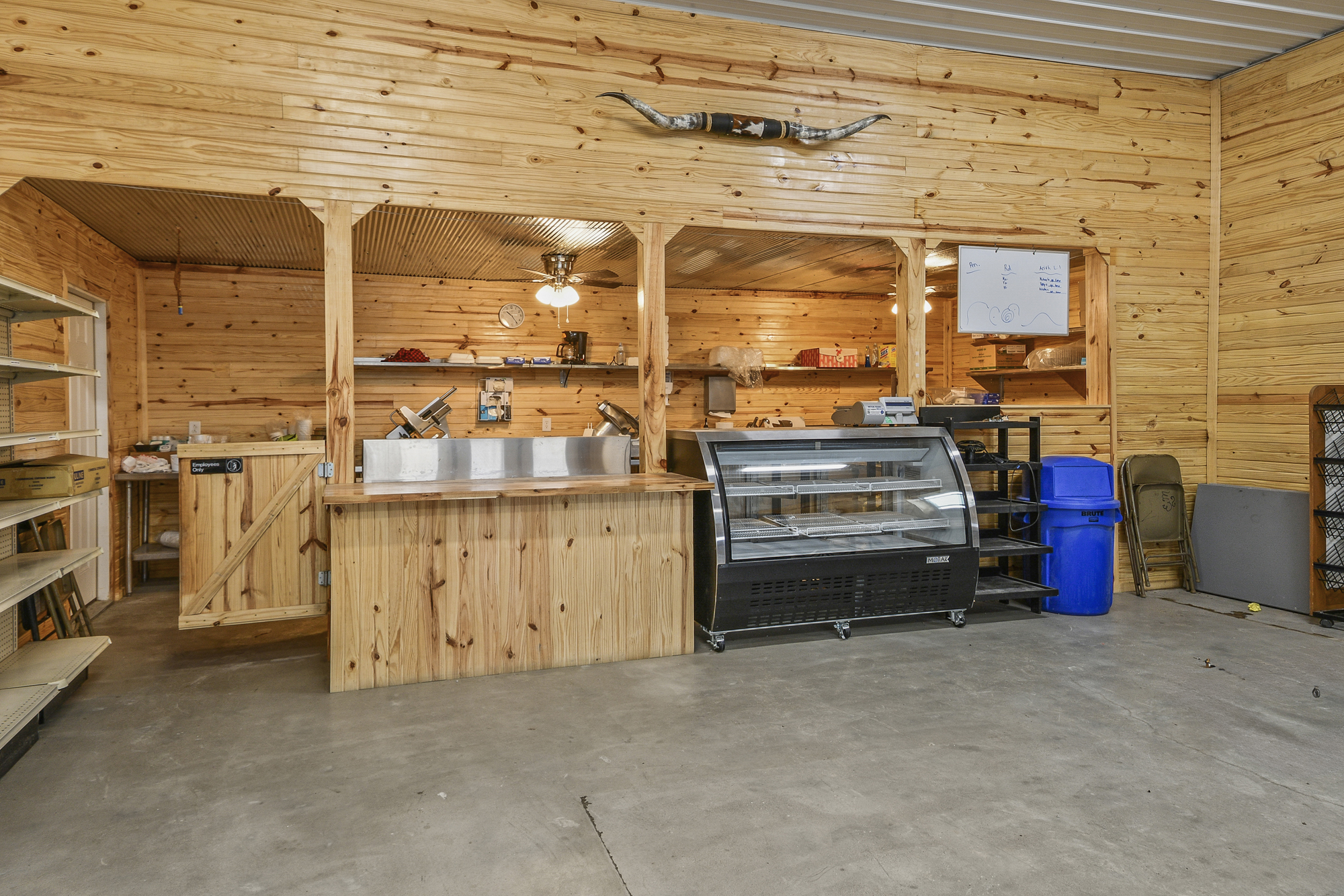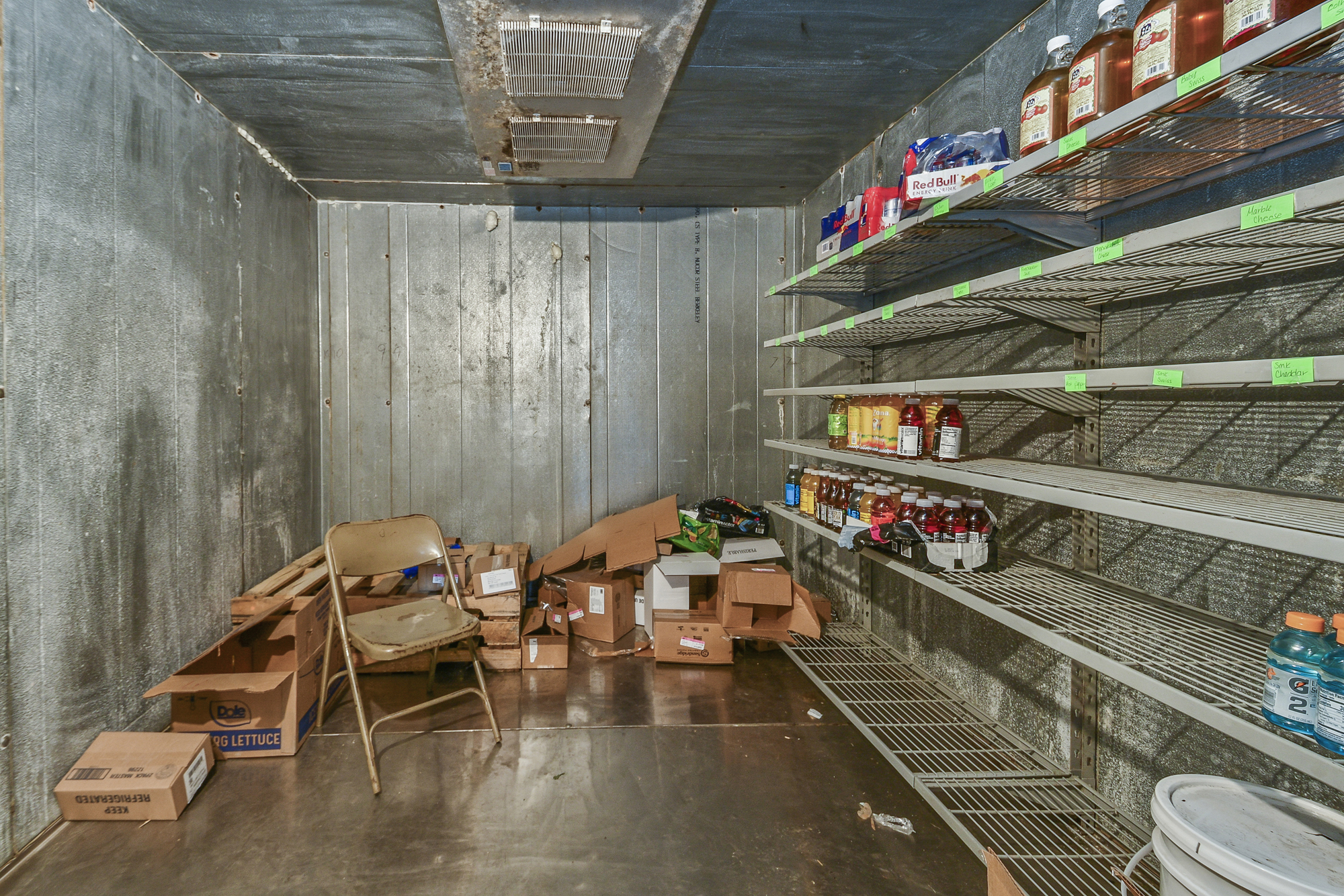 A 40x50 shop features a garage door and entry door, with half operating as an established wholesale fruit business. The insulated store side includes a concrete floor, heat & AC, and a commercially inspected kitchen area (equipment negotiable). The warehouse side offers two refrigerated trailers, a 10x12 walk-in cooler, garage door, and entry door for efficient distribution.