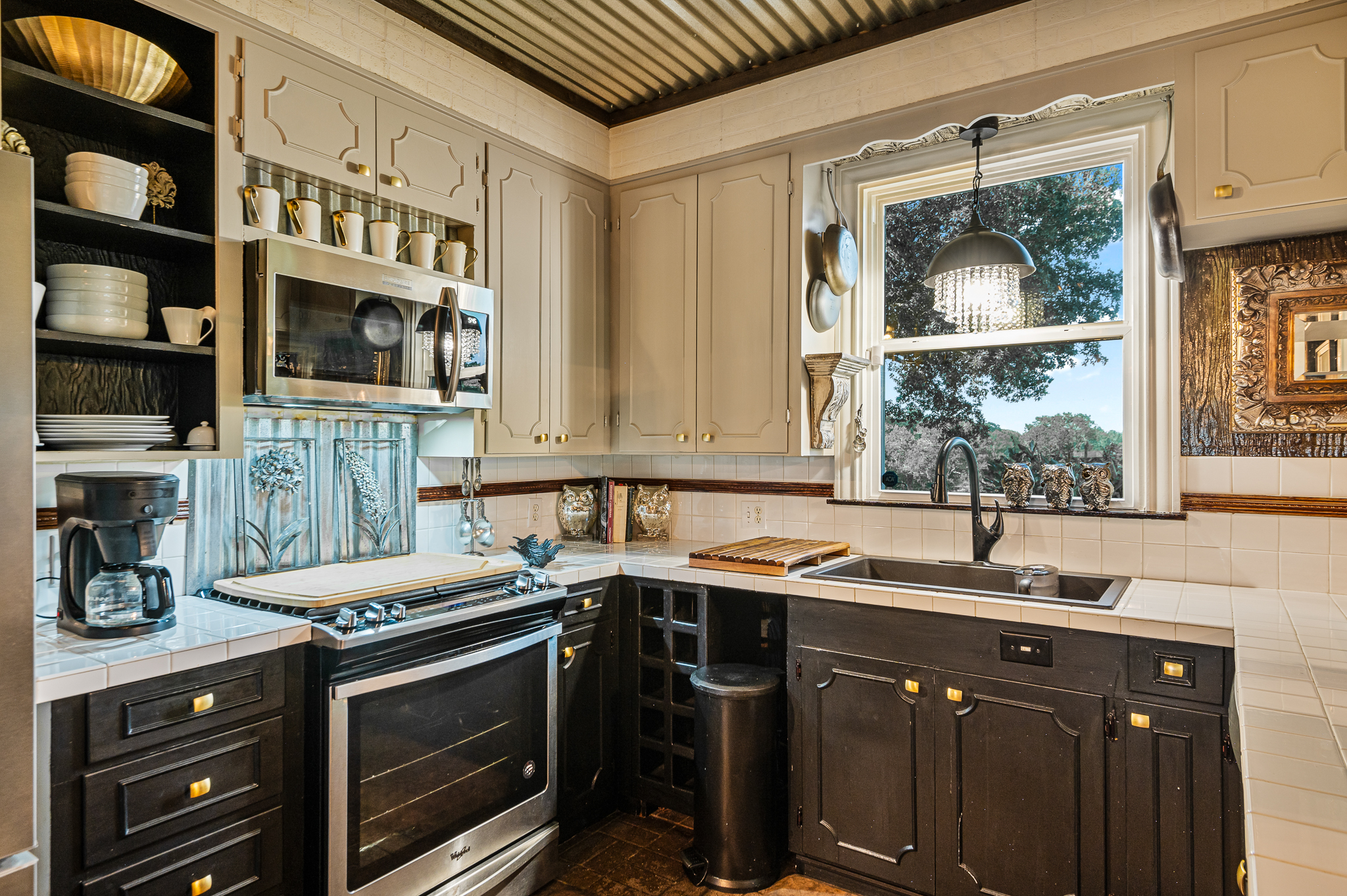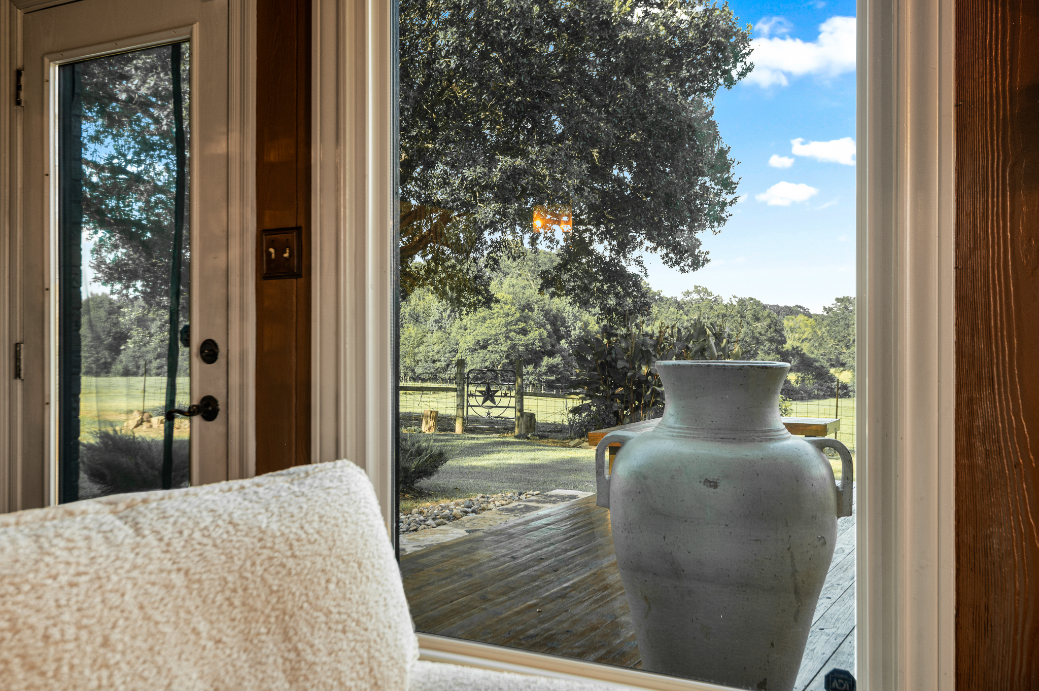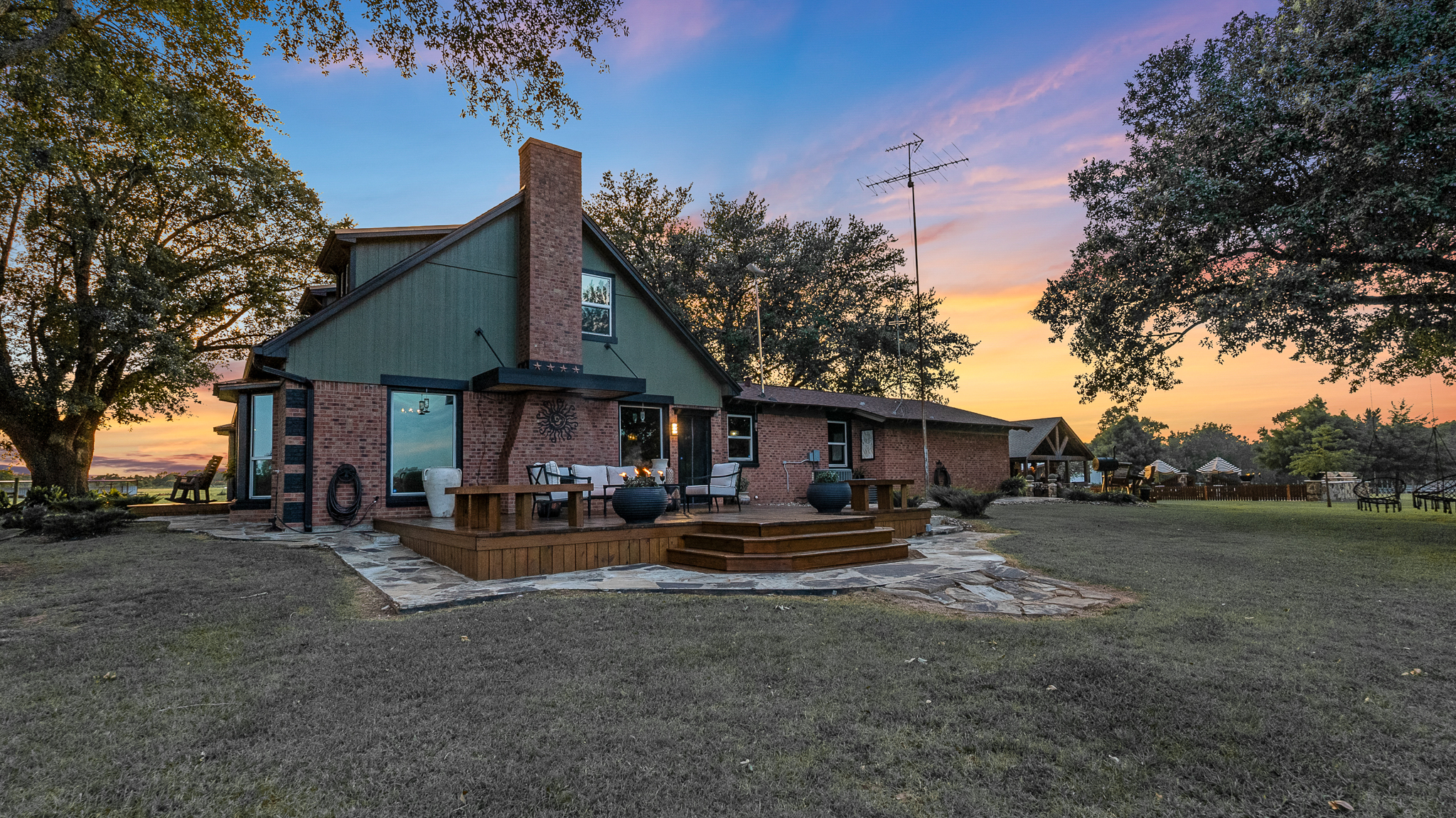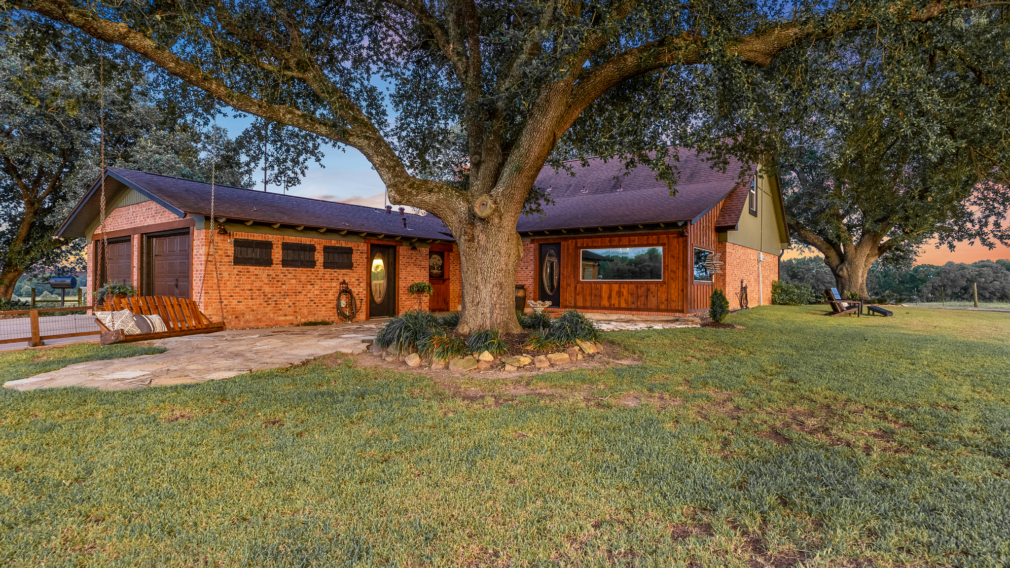The property's crown jewel is a 3,186-square-foot, two-story ranch home, strategically positioned on a hilltop for commanding views of the entire operation. Surrounded by massive ancient oak trees, this residence combines cowboy luxe with modern comfort.