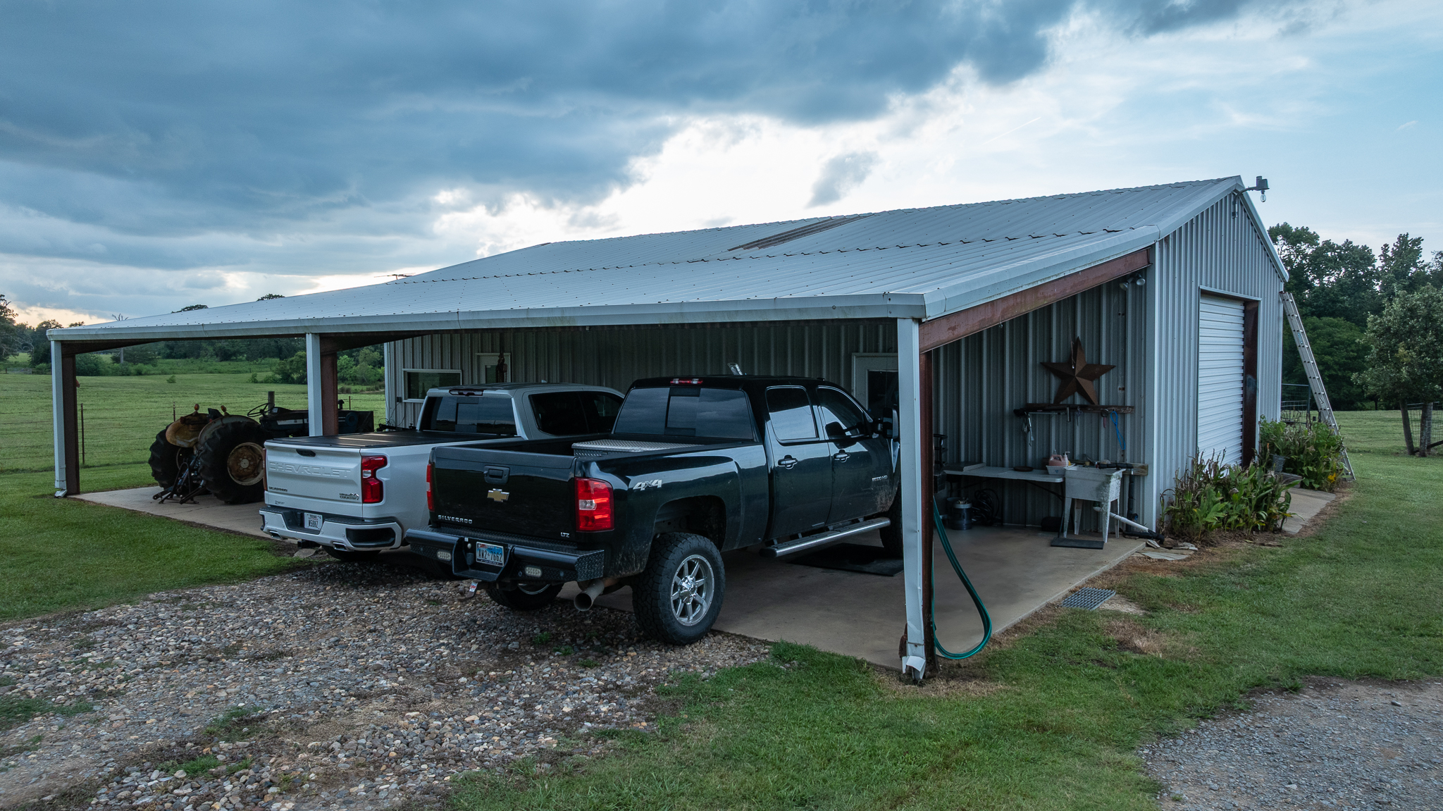Behind the main residence, a metal shop building doubles as a man cave, providing versatile space for hobbies, projects, or recreational activities. The covered parking and storage areas protect valuable equipment investments from East Texas weather while offering flexible spaces that can adapt to various needs, whether for business operations, additional storage, or pursuing personal interests and crafts.