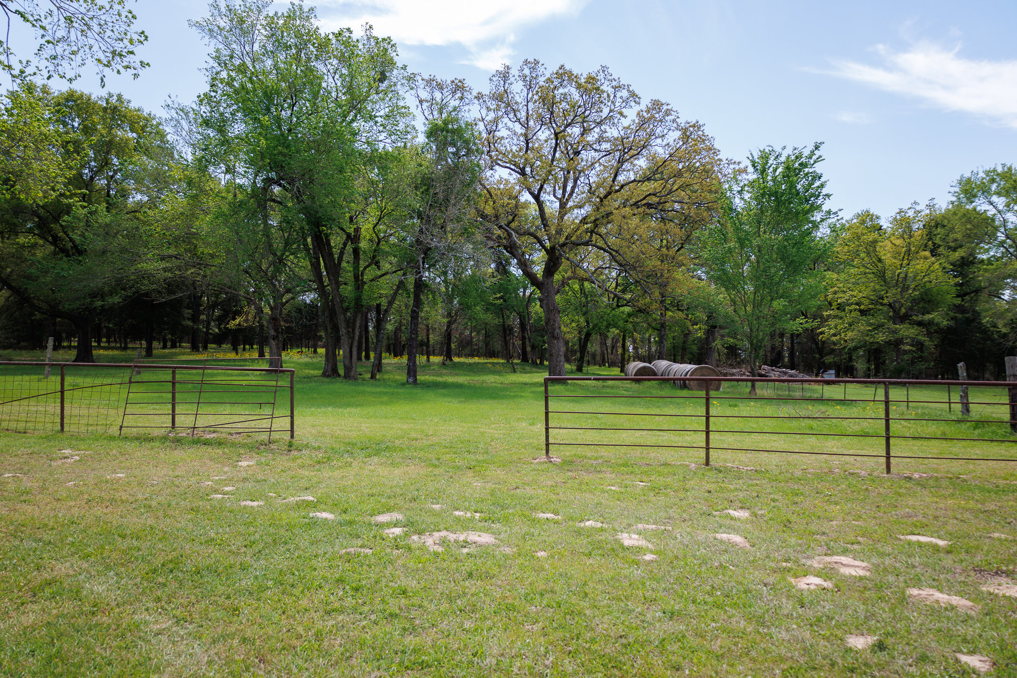 The tree-lined entry road sets the tone immediately. Mature Oak and Black Walnut trees line both sides, with green pastures extending outward beneath the canopy, a natural composition that took decades to establish. The front portion of the ranch is open and well-suited for cattle grazing, horse pasture, or hay production. Moving toward the back of the property, the terrain transitions into approximately 25 acres of mature Oak woodland. This wooded section is dense enough to provide a genuine wildlife habitat, while the Oak mast crop provides a natural food source that draws Whitetail deer. The variety of terrain across the 76 acres means the land functions differently in different parts, a practical asset for any buyer who wants more than a single-purpose tract.