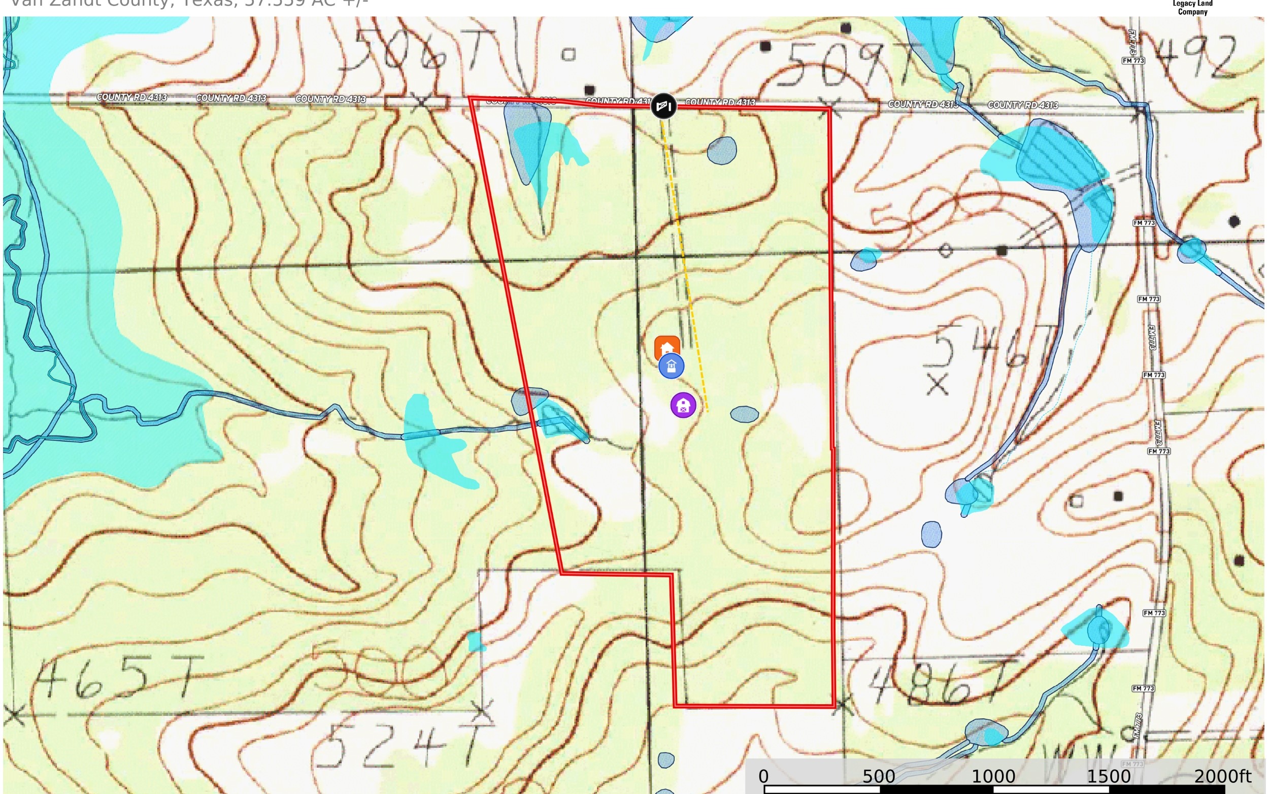 - Aerial Map Contours Water Ranch for Sale Ben Wheeler TX Van Zandt County 76 ac